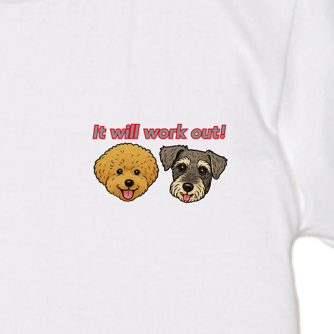 私の飼っている愛犬「カマロン・コロン」を可愛くロゴにしました。私自身、犬が好きで毎日癒されています。また、愛犬のロゴの上に、何とかなるよ・うまくいくよという意味を込めて「It will work out!」という文字を入れました。自分自身やこれを着てくれる方へのメッセージを込めたTシャツです。